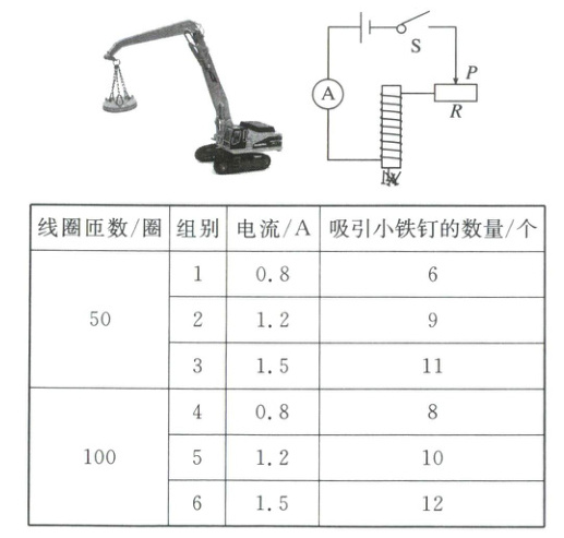 24. 某项目小组自制了一台电磁起重机,如图所示。为了研究如何增大电磁起重机的磁性,小组利用电磁起重机的电路图开展了如下实验探究,进行测量并记录,数据列于下表。