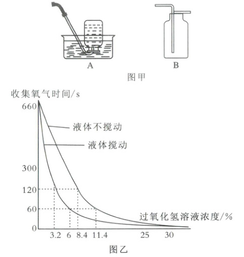 【实验结果】实验数据如图乙所示。若要在$1~2$分钟内收集$1L$氧气,则在液体不搅动时,适合选用的过氧化氢溶液浓度为