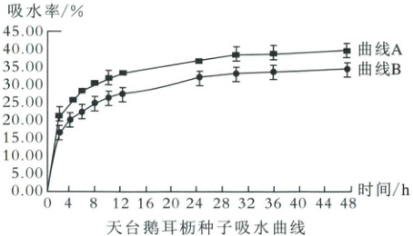。(4) 如图是天台鹅耳枥种子吸水曲线,吸水过程可以分为快速吸水($0~2h$)、缓慢吸水($2~30h$)和吸水饱和($30~48h$)3个阶段。对比两条吸水曲线的差异,分析判断哪条曲线是种皮损伤处理的种子,并说明判断原因: