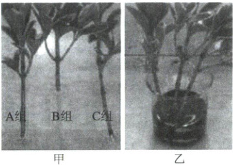 步骤一:他取了如图甲所示的同种木本植物枝条3根,其中对A组枝条不作处理;将B组枝条的下半部分树皮剥去;C组枝条除去下半部分的木质部和髓,只留下树皮。