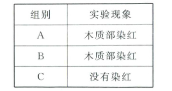 步骤二:处理好后,将每组枝条均插入盛有一定量稀红墨水的烧杯中固定(B组枝条只将剥去树皮的部分浸入红墨水中,C组枝条只将除去木质部和髓的树皮浸入红墨水中),10分钟后取出枝条,用刀片横切枝条中上部,观察横切面的染色部位,并将实验现象记录在表格中。
