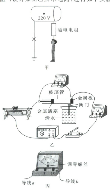 27. 给如图甲所示的电热水器金属内胆出水口加接一段长管道,由于长管道中水柱具有电阻(简称“隔电电阻”),在电热水器漏电且接地线失效时,能形成“防电墙”保障人的安全。为了探究“隔电电阻”阻值大小的影响因素,某校兴趣小组利用注水的玻璃管模拟“隔电电阻”,设计如图乙所示电路,进行如下实验。