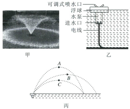 。③在三次喷水增氧作业中,控制水滴直径、喷水功率等其他条件不变,只改变喷水角度,水滴在空中运动轨迹如图丙所示。水滴在最高点$A$、$B$、$C$的速度分别为$v_A$、$v_B$和$v_C$,若不计空气阻力和水滴质量变化,则这三个速度的大小关系是