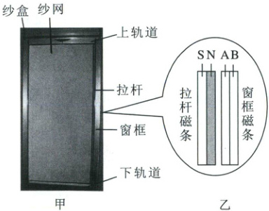 (1)当纱窗处于关闭状态时,拉杆磁条的磁极如图乙所示,则窗框磁条B侧为