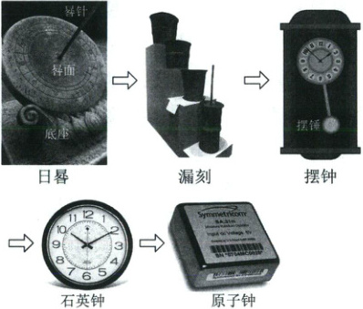 着时代发展在不断迭代,下图是不同年代部分计时工具的演变历程。(1)日晷是利用地球自转时太阳光线照射到晷针形成影子来确定时间的。在我国同一地点,夏至与冬至的正午,日晷影子的长度不同,这与