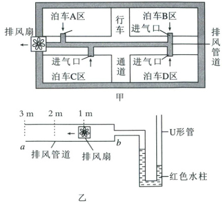 。(3)若该地下车库泊车B区和泊车C区管道进气口的气体流速大小分别为$v_{B}$和$v_{C}$,结合本实验的数据,请比较$v_{B}$和$v_{C}$的大小关系: