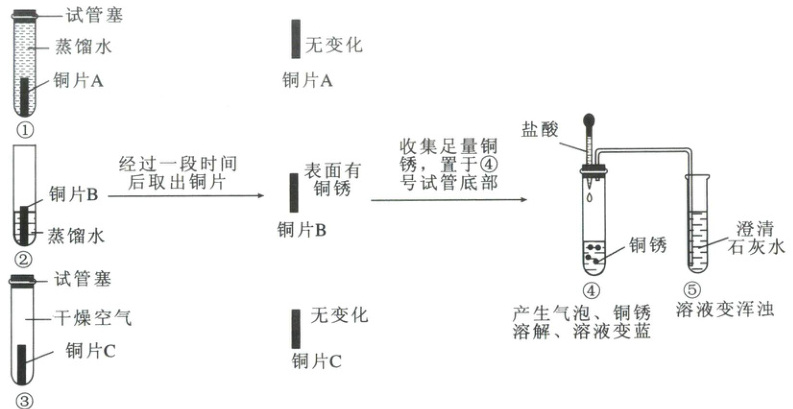 25. 小明发现处于潮湿环境中的铜制器具表面容易出现绿色铜锈,为了探究铜锈产生的原因以及其成分,小明进行如图所示的实验。