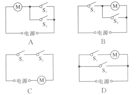 5. 校园安全至关重要,因此各校在入口处安装了门禁系统,如图所示。现要设计一款门禁系统,要求师生刷卡(相当于闭合$S_{1}$)或者人脸识别成功时(相当于闭合$S_{2}$),电动机启动,闸门打开放行。如图所示电路设计中符合上述要求的是(