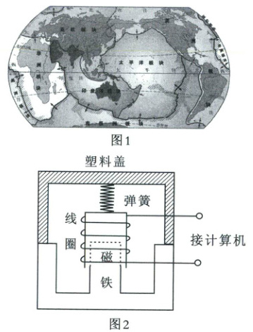板块发生碰撞引起的。(2)图2表示某地震仪内部简化结构。当地震发生时,线圈会在磁铁上上下移动,产生电流,通过分析电流信号,可以获得地震相关信息。该地震仪产生电流的原理是