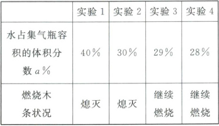 (4)查阅资料获知,木条能否继续燃烧是由容器内氧气的体积分数决定的。该同学在集气瓶中装入一定体积的水,如图3所示,然后用纯净的二氧化碳气体替换了瓶中的水,再用燃烧的木条检验,结果如表所示。则集气瓶中氧气体积分数小于