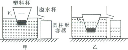 )。(2)向塑料杯中加水至V₀处,溢水杯中的水溢出到圆柱形容器中,如图乙所示。根据已学知识可知塑料杯中水的重力