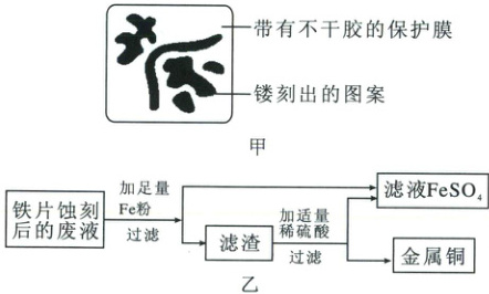 首先将不干胶保护膜(能隔绝蚀刻液与金属底板接触)分别贴到处理好的铝片和铁片上,在不干胶上镂刻出图案,去除图案处的不干胶,如图甲。将处理好的铁片浸入硫酸铜蚀刻液中,一段时间后取出,铁片上不干胶镂空处出现红色附着物。将铝片浸入另一种蚀刻液中,铝片上不干胶镂空处有凹陷,没有附着物。则铝片选择的蚀刻液可以是(