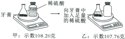 (2)根据质量守恒定律,化学反应前后物质的总质量不变,则生成二氧化碳的质量为108.20g - 107.76g = 0.44g。设牙膏中小苏打的质量分数为x。