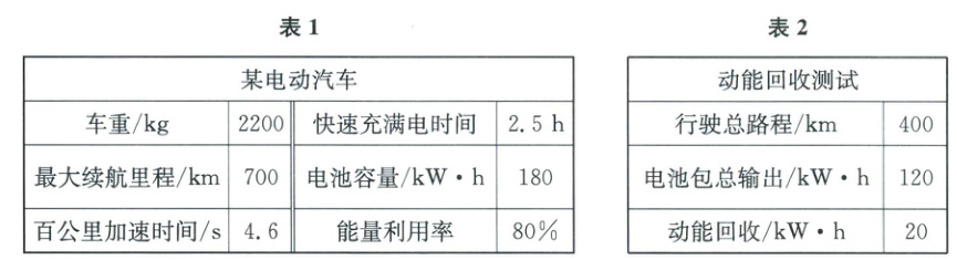 (2)解:$W_{有用} = \eta W_{输出} = 80\%×120kW·h = 96kW·h = 3.456×10^8J$,$F = \frac{W_{有用}}{s} = \frac{3.456×10^8J}{400000m} = 864N$ 答:动能回收测试当天该电动汽车的平均牵引力为864N。