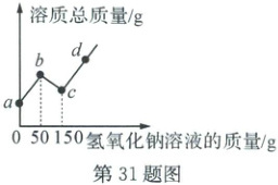 31. (7 分)往 $100\ g$ 硫酸和硫酸铜的混合液中,逐滴加入 $8\%$ 的氢氧化钠溶液直至过量,根据实验事实绘制了如图所示曲线,分析并计算。