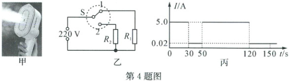4. (2025·金华金东)小科用图甲的手持挂烫机帮家人熨烫衣物,挂烫机内的水被加热汽化后喷出。图乙为挂烫机的等效电路,R₁为加热电阻,R₂为限流电阻,S为自动温控开关。将挂烫机接入电路,S在位置“1”,前端电热板被加热,电路中的电流为5.0 A;当温度升到130℃时,S切换到位置“2”,挂烫机处于待机状态,电路中的电流为0.02 A,当温度降到100℃时,S又回到位置“1”。求: