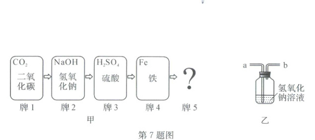 7. (2025·台州路桥)小柯和小妍用自制的扑克牌玩“物质接龙”游戏,其规则是“相邻扑克牌中的物质均可发生化学反应”,如图甲所示。请回答下列问题。
