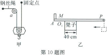 10. (2025·义乌)建筑工地上经常用长臂大吊车来输送建筑材料,安装建筑构件,图甲是其钢丝绳缠绕简化示意图(其中动滑轮重、绳重及摩擦均不计),喜欢实践的小科同学,自己也尝试设计了类似的吊车模型(如图乙),其中AP为粗细均匀的直棒,长1.8米,重力为10牛,凳子宽度为40厘米,A下端固定一个铅块M。