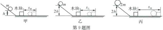9. (2025·湖州吴兴)小吴同学做“探究物体的动能大小跟哪些因素有关”的实验中,用质量为m、2m的两个钢球,分别从同一斜面的h、2h高度由静止开始滚下,观察木块被撞击后在水平木板上运动的距离,实验过程如图所示(S甲<S乙<S丙)。回答下列问题。