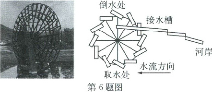 6. (2025·新昌)《天工开物》是我国古代的科学著作,书中记载着大量的古代农业机械。其中这样写道:“凡河滨有制筒车者,堰陂障流绕于车下,激轮使转,挽水入筒,一一顷于枧内,流入亩中,昼夜不息,百亩无忧。”该段文字描述了筒车这种以水流作动力,用来取水的机械,如图所示。某筒车的接水槽比取水处高4m,水轮上有12个取水筒,一个取水筒每次可取水2.2kg,该筒车旋转一周所用的时间为60s,如此工作一昼夜,可以灌溉百亩良田。(接水槽离倒水处的高度忽略不计)