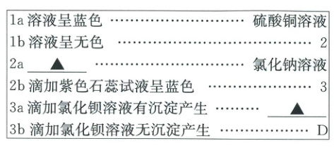 21. 小嘉参照生物的二歧分类检索表,对一些物质进行区分。现有 A、B、C、D 四种溶液,它们分别是氢氧化钠溶液、硫酸铜溶液、碳酸钠溶液和氯化钠溶液中的一种。他制作了右面所示的分类检索表,请帮他将“▲”中的有关内容补充完整。