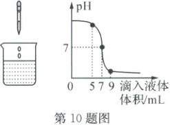 D.当滴入液体体积为9mL时,溶液中的溶质为NaCl和NaOH