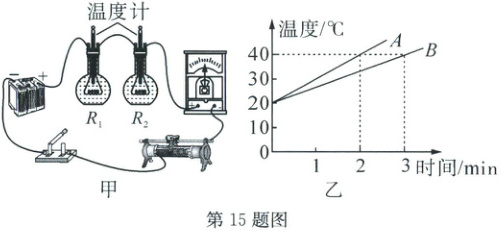 15.D 解析:A、B:规格相同的烧瓶内装了相同质量的煤油,烧瓶内的电阻$R_1>R_2$,通电2分钟时,根据$Q = I^{2}Rt$可知电阻$R_1$所在的烧瓶中煤油吸收的热量较多;从题图乙可知通电相同时间时A的温度变化量较大,根据$Q = cm\Delta t$可知,题图乙中A表示$R_1$所在烧瓶中煤油的温度变化情况,故A、B错误;C、D:根据$P = I^{2}R$可知实验过程中,电阻$R_1$的发热功率大于$R_2$,为使煤油升温更快,可让电路中电流变大,总电阻变小,题图甲中滑动变阻器的滑片可向左移动,故C错误,D正确。故选D。