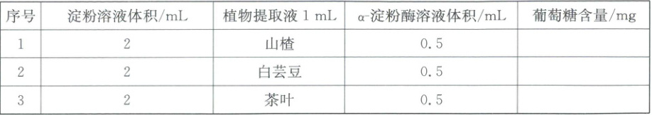 23. α-淀粉酶在分解淀粉时最终产物以葡萄糖为主。小科查阅文献发现山楂、白芸豆和茶叶均对α-淀粉酶有抑制作用,为比较它们抑制作用的强弱,小科在pH、温度等条件都相同且适宜的情况下进行了如下实验。