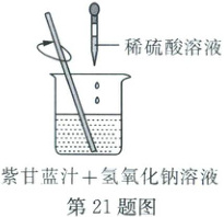 21. 小科用稀硫酸、氢氧化钠溶液、紫甘蓝汁研究酸碱反应,如图所示烧杯中装有含紫甘蓝汁的氢氧化钠溶液(pH=10),向其中滴入稀硫酸溶液。已知紫甘蓝汁的变色范围如表所示。