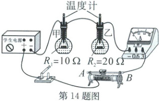 14.D 解析:本实验运用了转换法,将电流产生的热量转化为煤油升高的温度,可通过温度计的示数变化来判断,故A正确;该装置中电流和通电时间都相等,但两电阻丝的阻值不同,故可探究电流通过导体产生的热量多少与电阻大小、通电时间的关系,电路中有滑动变阻器,故能探究电流通过导体产生的热量多少与电流大小的关系,故B正确;在液体质量相同,吸收热量相同的情况下,比热容小的物质温度要升高得多,所以用比热容小的液体可以使实验现象更明显,故C正确;比较水和煤油的比热容大小时,要使它们在相同时间内吸收相同的热量,所以要使两瓶中电阻丝的阻值相同,故D错误。故选D。