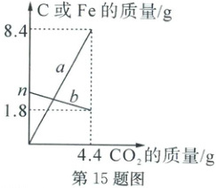 15.C 解析:反应物碳的质量逐渐减小,生成物铁的质量逐渐增加,所以a表示生成的铁的质量变化,故A正确;由题图可知,生成二氧化碳的质量为4.4g,4.4g二氧化碳中碳元素的质量$=4.4g×\frac{12}{44}×100\%=1.2g,$根据质量守恒定律,反应前后元素的种类和质量不变,所以反应前碳元素的质量为1.8g+1.2g=3g,n=3,故B正确;