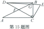 15.(2024·仙居)如图,在 $ \triangle ABC $ 中,$ \angle ACB = 90^{\circ} $,将 $ \triangle ABC $ 绕点 $ C $ 顺时针旋转得到 $ \triangle DEC $,旋转角为 $ \alpha $,$ CD $,$ DE $ 分别交 $ AB $ 于点 $ F $,$ G $,连接 $ BD $。