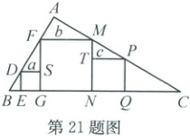 21. (2024·台州椒江、天台)(8 分)如图,在 $Rt\triangle ABC$ 中,$\angle A = 90^{\circ}$,内有边长分别为 $a,b,c$ 的三个正方形.