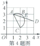 4.$\frac{\sqrt{5}}{4}\pi$ 解析:如图,取AC中点T,连接ET,CD.$\because\angle ABC=90^{\circ}$,$\therefore AC$为直径,$\therefore T$为$\overset{\frown}{CE}$所在圆的圆心,$\because AC=CD=\sqrt{1^{2}+2^{2}}=\sqrt{5}$,$AD=\sqrt{1^{2}+3^{2}}=\sqrt{10}$,$\therefore AC^{2}+CD^{2}=AD^{2}$,$\therefore\angle ACD=90^{\circ}$,$\therefore\angle CAD=45^{\circ}$,$\therefore\angle ETC=2\angle CAD=90^{\circ}$.$\because TC=ET=TA=\frac{\sqrt{5}}{2}$,$\therefore l_{\overset{\frown}{CE}}=\frac{90\pi×\frac{\sqrt{5}}{2}}{180}=\frac{\sqrt{5}}{4}\pi$.