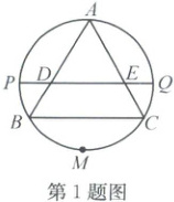 1.A 解析:连接AM与PQ交于点O,$\because AB=AC$,$\therefore\widehat{AB}=\widehat{AC}$,又$\because BM=CM$,$\therefore\widehat{ABM}=\widehat{ACM}$,$\therefore AM$为直径,又$\because$点A与点M重合,$\therefore PQ$为直径,$\therefore$点O为圆心,$\therefore$易得$OA=OQ=\frac{1}{2}PQ=3$,且易证$\triangle ADE$为正三角形,$\therefore DE=2\sqrt{3}$.故选A.