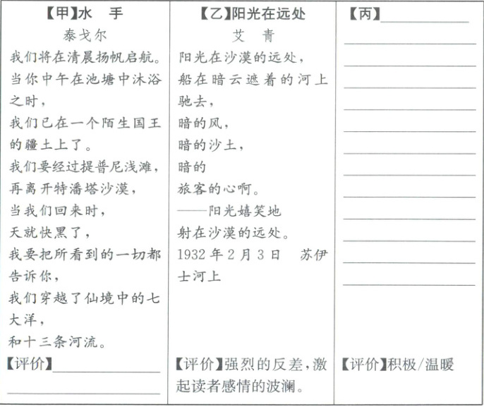 3. (2025·东阳)诗歌点评与创作。点评甲诗,仿照甲、乙两首诗歌,自创一首小诗(不少于四行)。