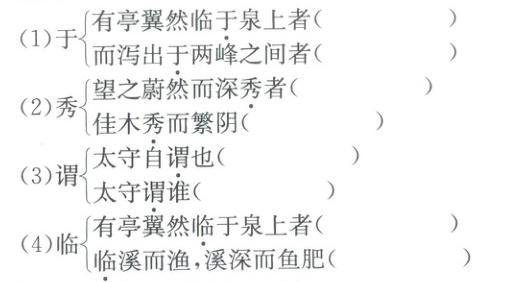 1.尤其,特别 茂盛的样子 像鸟张开翅膀一样 居高面下 命名,取名 就 寄托 弥漫的云气 聚拢 昏暗 暗 花 开放 好的 茂盛 背着东西的人 休息 回应 弯腰曲背,这里指老人 牵扶,这里指被牵扶的人,即儿童 陈列,摆开 尽兴地喝酒 下棋 倒下的样子 不久 记述