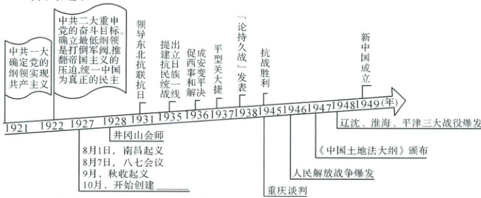 (2)在年代尺的“”处填入合适的内容,指出中国革命新道路的主要内容。(5分)