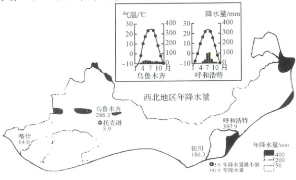 阅读“西北地区年降水量分布示意图”,回答第 8~9 题。