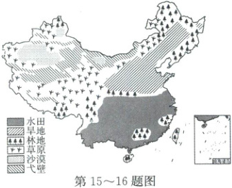 海水稻是一种耐盐碱、能在海水灌溉条件下生长的水稻品种。从目前来看,我国内陆尚有 15 亿亩盐碱地,其中 2 亿亩具备种植水稻潜力。读“我国土地利用类型分布图”,完成第 15~16 题。