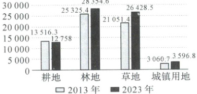 土地资源是人类赖以生存的基本资源之一,2024 年第 34 个全国土地日活动主题是“节约集约用地,严守耕地红线”。读我国四类土地类型 2013 与 2023 年面积对比统计图,完成第 17~18 题。