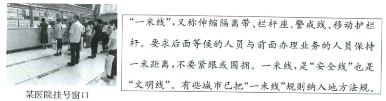 (2) 请从“维护秩序靠规则”的角度,说说生活中设置“一米线”的理由。(4 分)