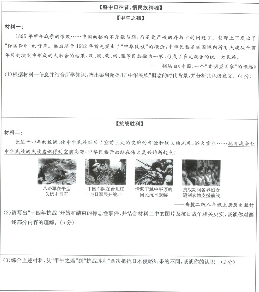 (3)示例:抵御外来侵略除了需要中国人民的英勇抗战,还需要中华民族意识的觉醒,凝聚民族力量,加强民族团结。(言之有理即可,2分)
