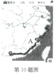 台州市的小明计划寒假期间和家人自驾前往珠江三角洲地区,途中在各地旅游打卡集印章,出发前他用手机搜集相关资料。读“手机导航图”,完成第 10 题。