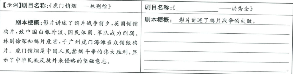 (1)剧目名称:太平天国运动(1分) 剧本梗概:(影片讲述了鸦片战争的失败,)进一步加深了清政府的统治危机,统治阶级与劳动群众之间矛盾日益尖锐。洪秀全发动太平天国运动,意图推翻清王朝的腐朽统治。这场起义最终失败了,但它是中国历史上规模最宏大的一次农民战争,沉重打击了清朝的统治和外国侵略势力。(4分)