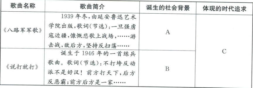 (2)为展现这两首歌曲中所蕴含的时代价值,请完成相关资料的填写。(6 分)