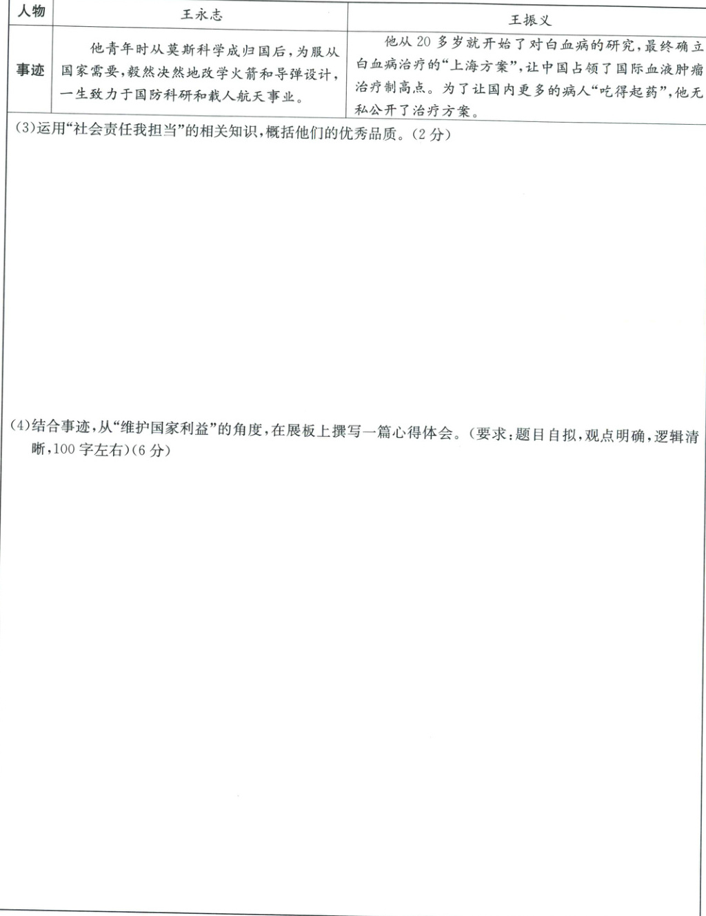 (4)示例:汲取榜样力量,勇护国家利益。(言之有理即可,1分) “王永志服从国家需要,毅然决然地改学火箭和导弹设计,王振义为了让更多的病人‘吃得起药’,无私公开治疗方案”说明当个人利益与国家利益发生矛盾时,他们皆以国家利益为重,把国家利益放在第一位(或说明他们认识到国家利益关系民族生存、国家兴亡,维护国家利益是实现国家富强、民族振兴、人民幸福的重要保证)。(3分)我们青少年要树立维护国家利益意识,自觉捍卫国家利益。(2分)