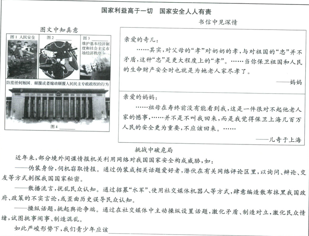 (3)增强国家安全意识,树立国家安全利益高于一切的观念,自觉履行维护国家安全的义务;(2分)增强防范意识,提高防范能力,善于识别维护国家安全的各种伪装,为维护国家安全贡献自己力量。(2分)