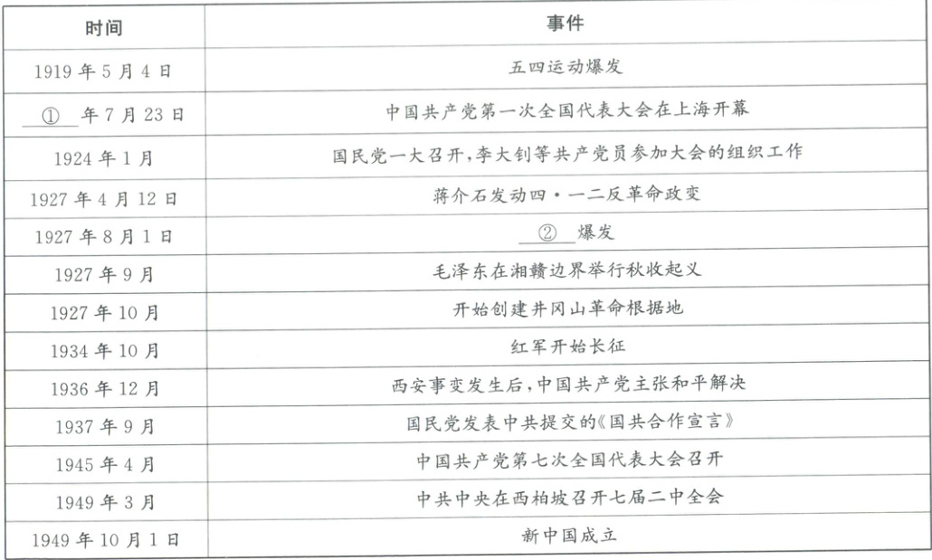 (2)党在革命过程中先后与国民党进行过两次合作,请在大事年表中找出对应的标志性事件,并分别列举合作成果。(4 分)