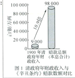 (3)示例一:图1:《辛丑条约》清政府赔款白银4.5亿两,分39年还清,本息共计9.8亿两。(2分) 危害:赔款数额在近代不平等条约中最为庞大,远高于清政府的年财政收入;清政府的经济长期受制于列强,大大加重了人民的负担。(4分)